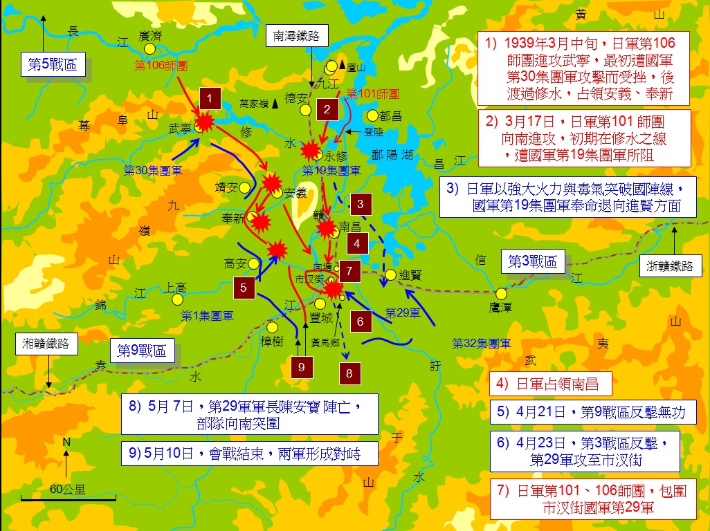 1939年3月17日,日軍以兩個師團之兵力,於鄱陽湖西岸兵分兩路,準備會攻南昌。一開始,日軍第106師團受挫於國軍,惟仍渡過修水,攻下安義、奉新;第101師團因遭國軍第19集團軍堅強抵抗,乃使用大量毒氣,於突破國軍防線後,攻占南昌。國軍第19集團軍,遂奉命向進賢方面撤退。