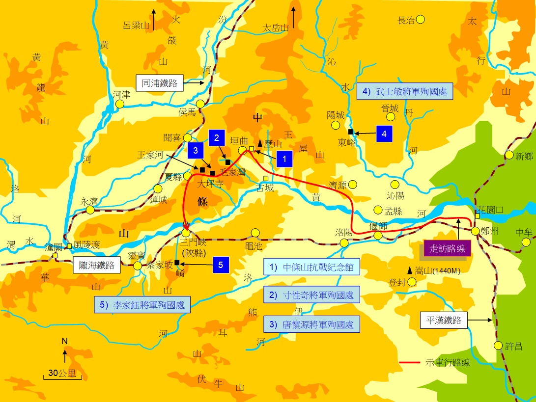 在「中條山會戰」中陣亡的重要幹部,還有新編27師師長王竣、副師長梁希賢、參謀長陳文杞與副官主任郭則溫等人。會戰之後,國軍向黃河南岸及周邊山區轉進,繼續與日軍戰鬥;1941年9月29日,第98軍軍長武士敏中將,也陣亡於沁水上的東峪(位置見圖10)。由於我們行程匆匆,無法一一去到他們殉國的地方弔念,只能在此山中遙寄哀思,聊表崇敬之意。