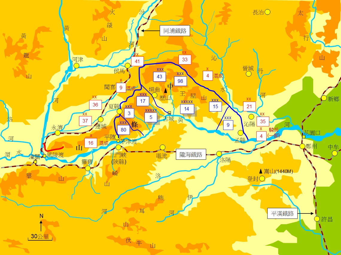 當時,國軍在中條山兵力約10餘萬人,背對黃河,編組「據點式」防禦陣地。日軍則從各地抽調約20萬人的部隊,並有第3飛行集團,約3百架飛機支援。其戰力,至少是國軍的10倍以上。(如圖2示意)。