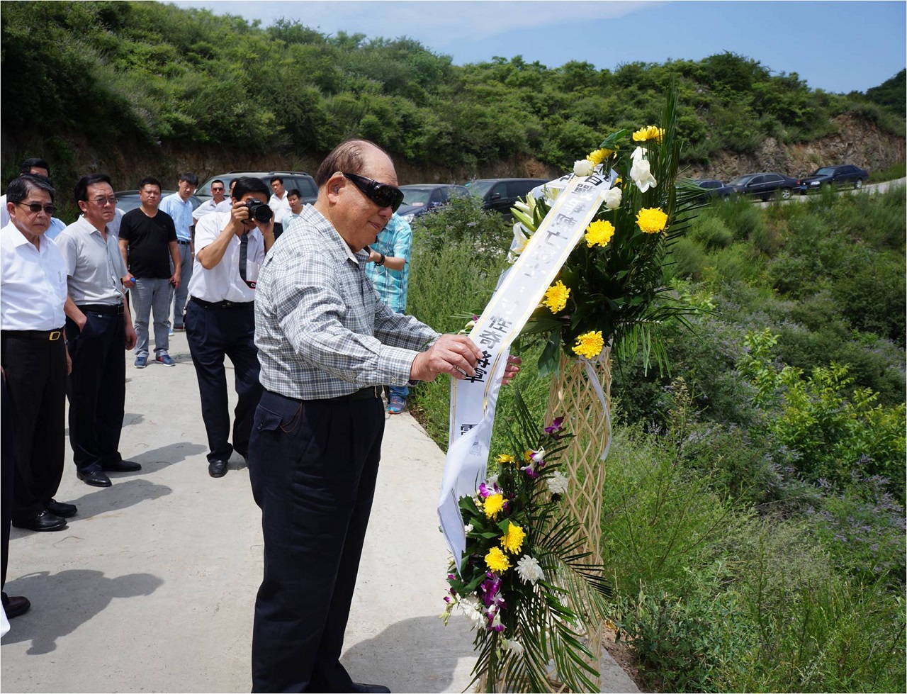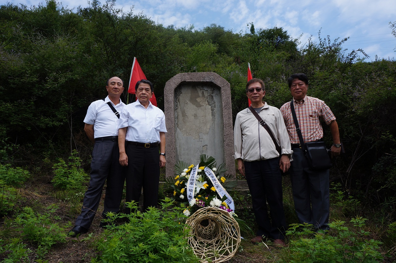 圖6. 2014年7月12日,(左起)胡筑生、黃炳麟、傅應川、何世同四位將領翻越胡家峪山溝,代表郝先生至寸性奇將軍「衣冠塚」前獻花致敬