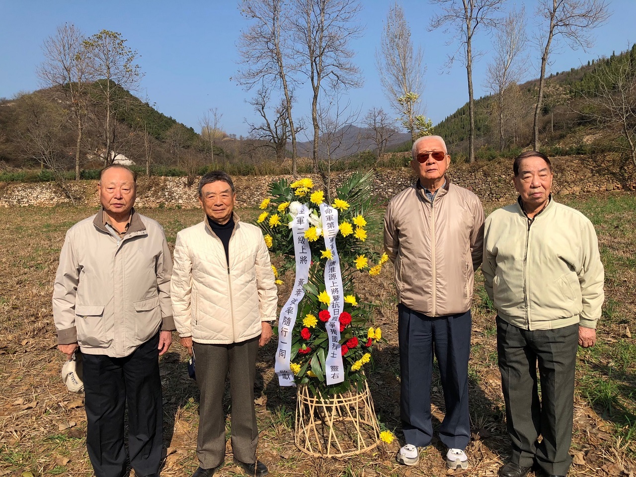 圖5. 2017年11月6日,黃幸強等四位上將代表郝先生在泗交鎮的大寺坪村遙祭唐淮源軍長,遠處小高地即唐上將殉國處(左起:王文燮、黃幸強、陳廷寵、李楨林)