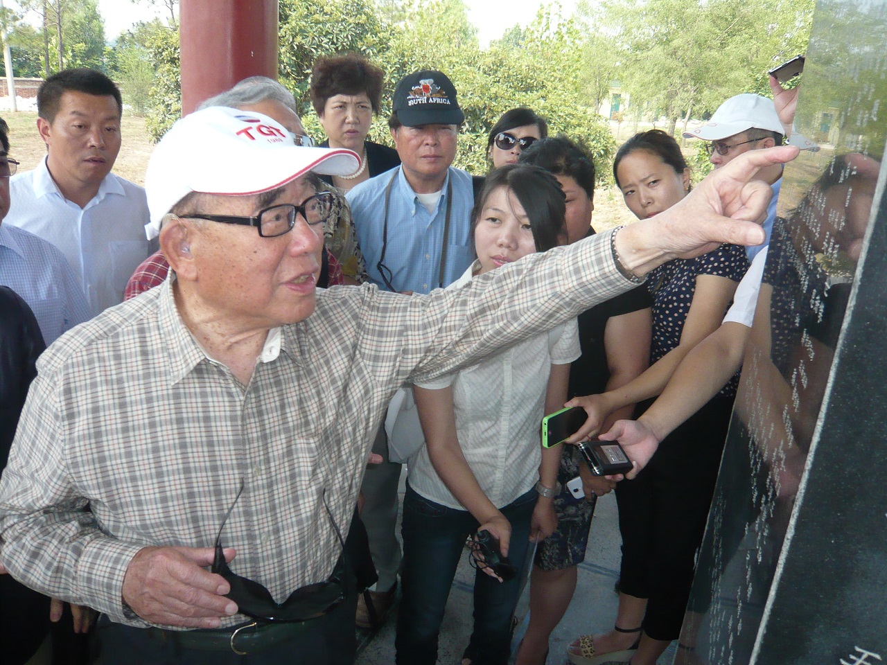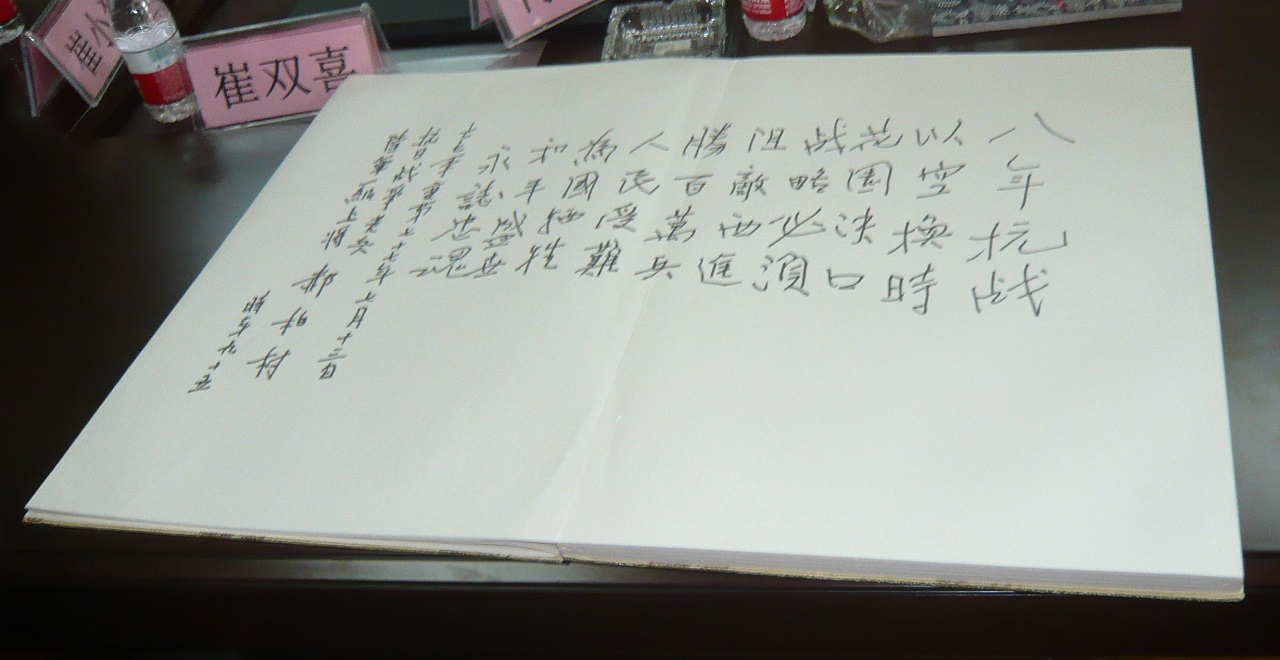 圖11. 2014年7月13日,郝先生參訪花園口園區「黃河博物館」時應邀題下「八年抗戰,以空換時,花園決口,戰略必須,阻敵西進,勝百萬兵,人民受難,為國犧牲,和平盛世,永誌忠魂」