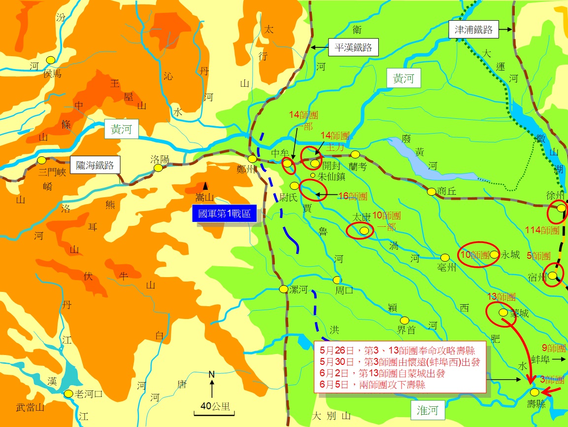 國軍於「徐州會戰」末期,轉進至平漢鐵路之線,日軍沿隴海鐵路西進,跟隨其後。6月4日占領蘭考,6日占領開封;此時,日軍先頭部隊距鄭州僅約40多公里,鄭州告急。(如圖2示意)。