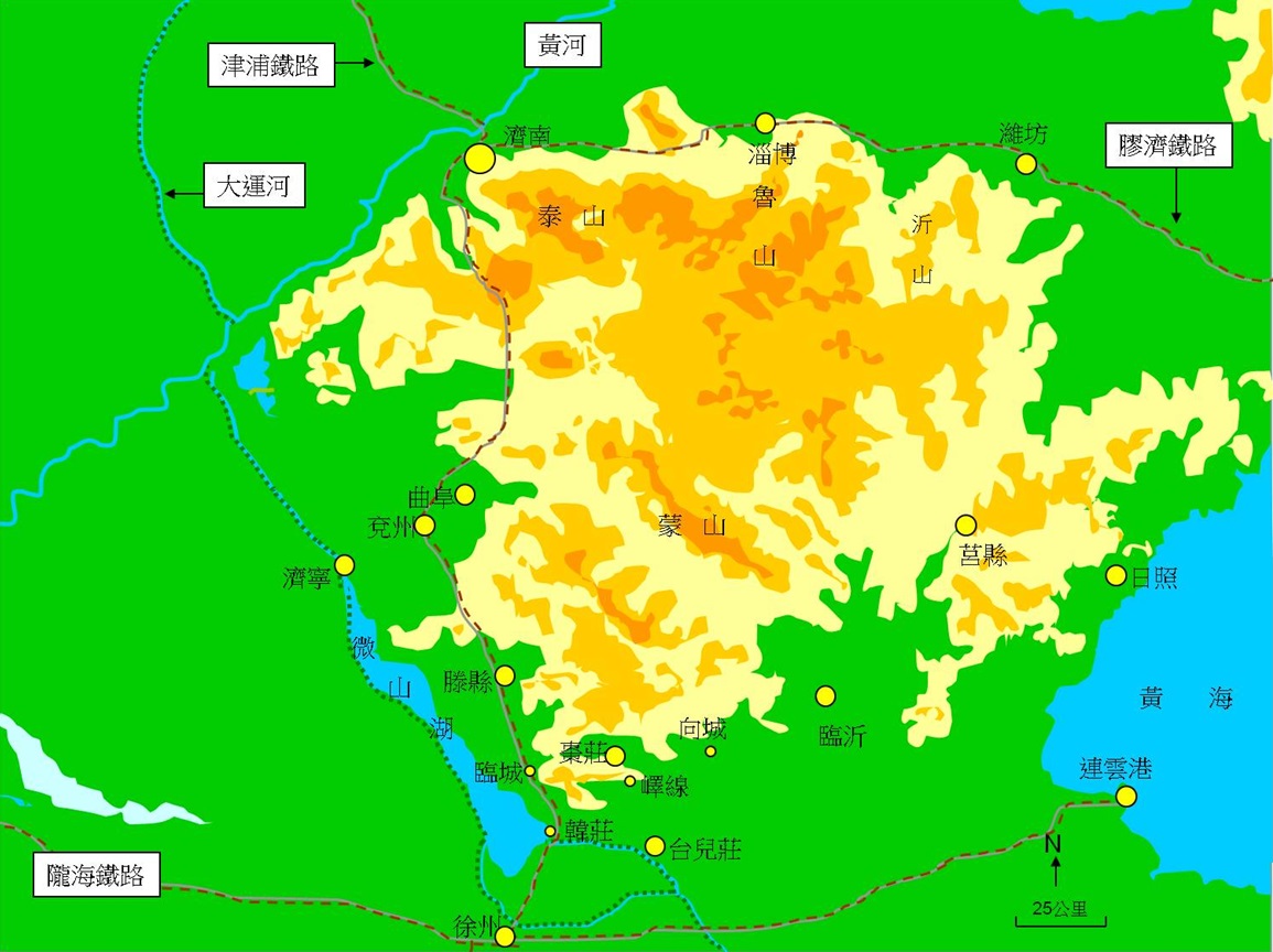 滕縣現稱滕州市,位在山東省南部,是棗莊市下轄的縣級市。位在微山湖之東,蒙山之西,是自山東南部通往南北所必經。在「徐州會戰」中,台兒莊是徐州的門戶,滕縣則是台兒莊的外圍據點。
