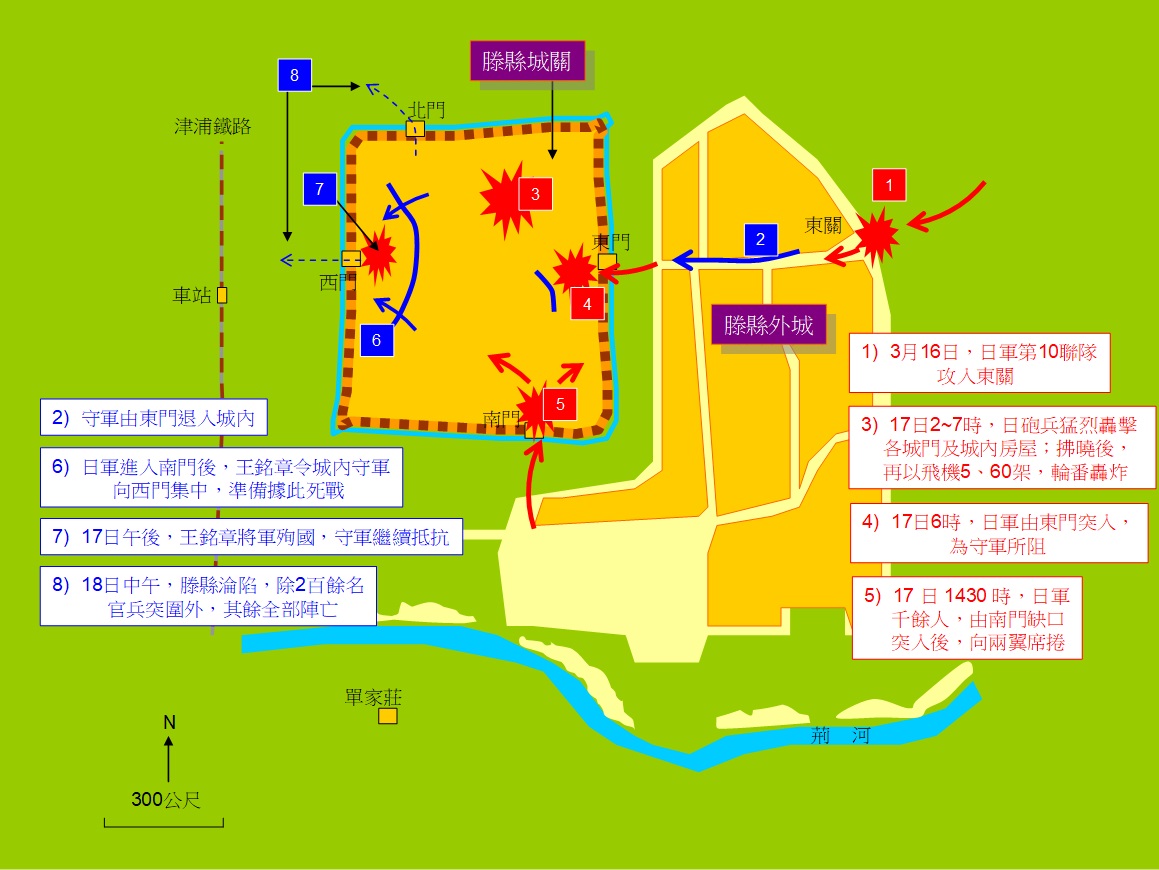 從3月14日至18日,日軍第10師團在優勢火力援助下,接連突破滕縣外圍陣地、外城、城牆與城內。期間,守軍以僅有之15個連兵力,與數量絕對優勢之敵頑抗,國軍死傷慘重。王銘章代軍長則於17日下午率重要幹部督戰之時,遭敵機槍掃射,身中七彈。臨終之際,有敵兵數人接近,遭王代軍長連斃其三,餘眾驚退。