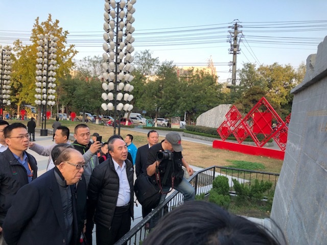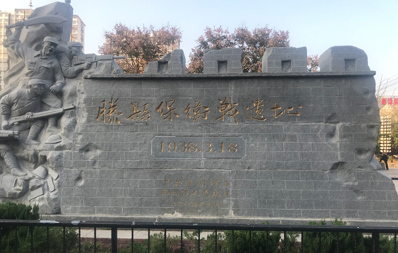 2017年11月3日下午4點許,我們來到滕州市「市民廣場」南側的一座仿城牆建物,正面刻著「滕縣保衛戰遺址─1938‧3‧18」的金色大字,左邊連著城牆的是5名軍人,在斷垣殘壁中,手舉刀槍,保衛滕縣的戰鬥場景浮雕,眼神傳達了同仇敵愾、視死如歸的表情,栩栩如生。由此時間點看來,這些軍人顯然就是國軍第122師的戰士。