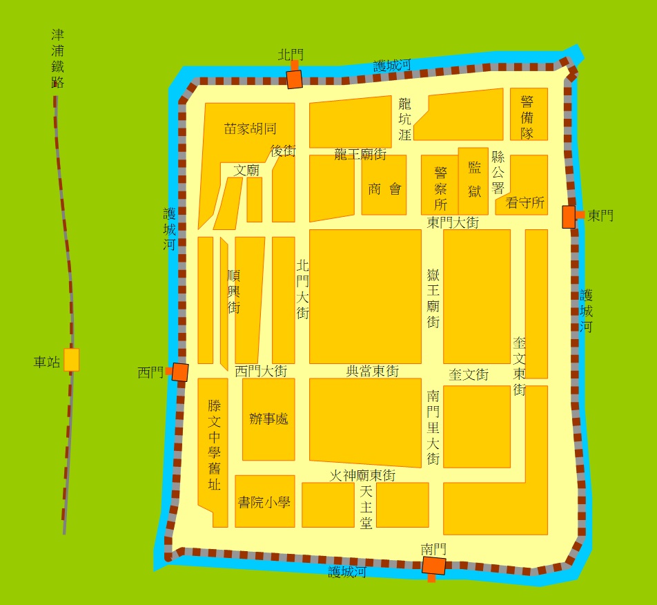 滕縣和台兒莊一樣,是座有城牆,有護城河,結構方正,歷史悠久的古城,然而卻全毀於日本的侵略戰火,現在只剩一堵仿造的城牆,空留回憶,令人扼腕。如果沒有日本人的破壞,現在此古城一定是聯合國紀錄的「世界遺產」。抗戰前的滕縣縣城平面,如圖7所示;圖8為當年日軍攻城前,對城牆結構所做的分析。